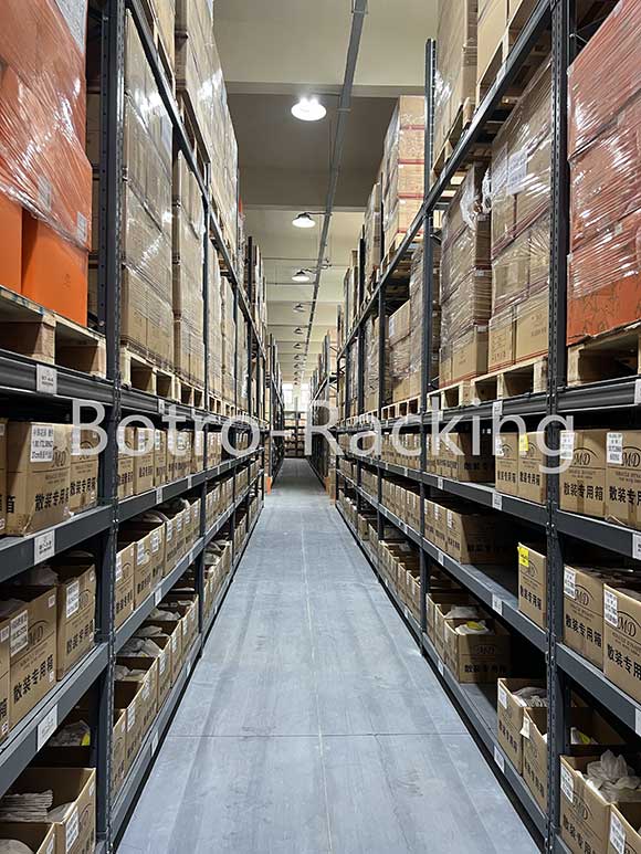 采用窄巷道设计,通道宽度较窄,一般在 1.6 米至 2 米之间,可最大化利用仓库空间。